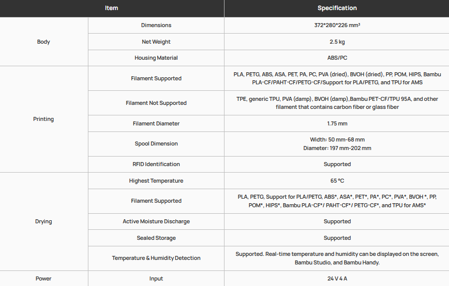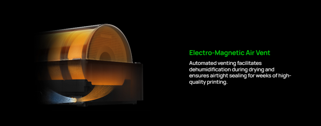 Active Drying & Airtight Storage Keeps filament at an optimal moisture level thanks to a built-in drying function with a 65 °C air vent and sealed compartment. Say goodbye to brittle or warped filament.