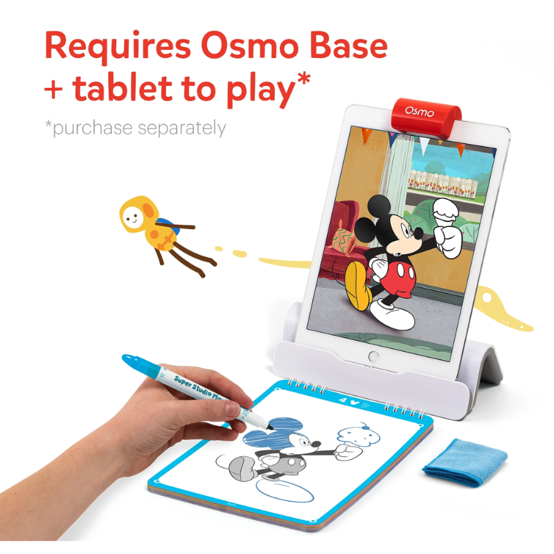 • Interact with favorite Disney characters in Super Studio Mickey Mouse and his friends by Osmo, while learning the fundamentals of drawing. You can now animate your own scenes and navigate multiple adventures, and watch your drawings come alive on screen! Join your favorite characters in their adventures! The whole gang will star in your show, as Mickey and his friends go on an epic adventure through a sunny day. There is a big birthday party, a day in the park, and the big finale — the epic beach day!